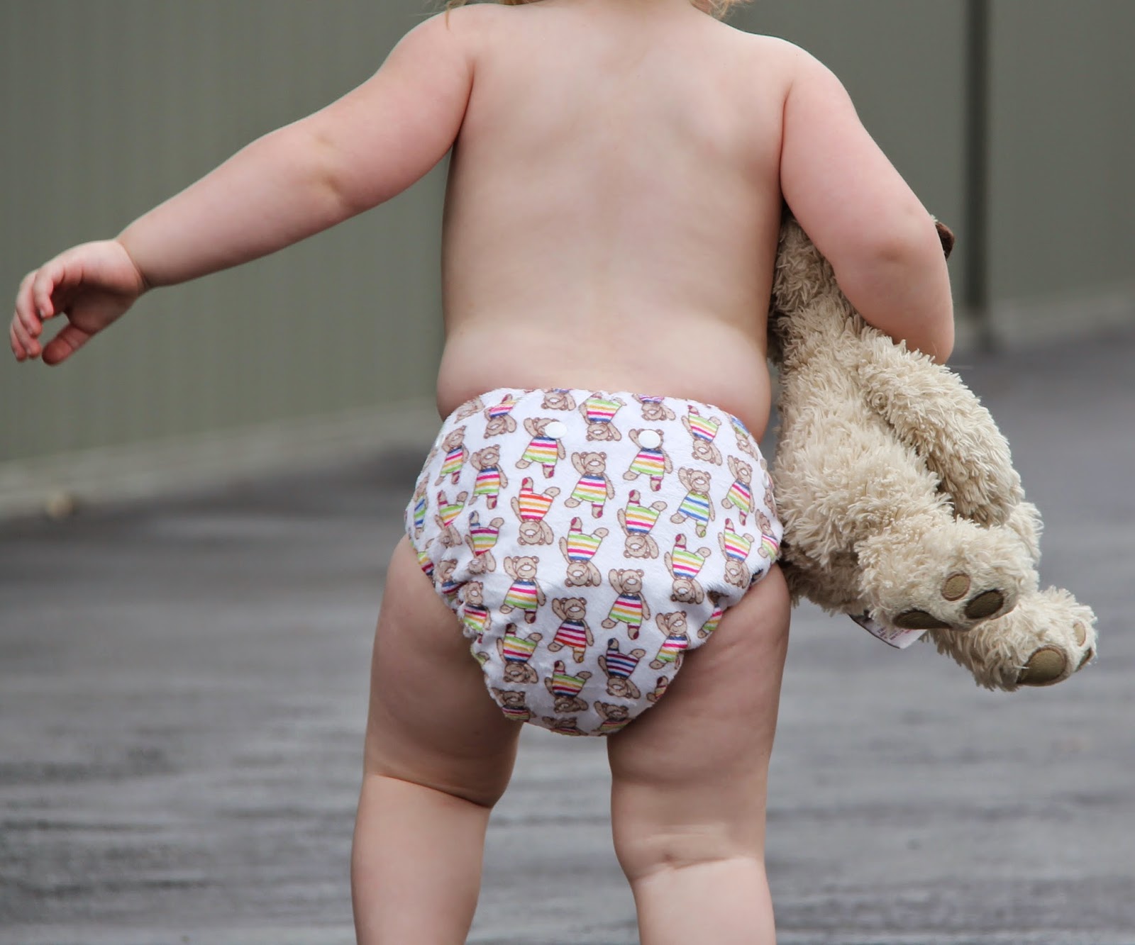The nappy has been designed to fit a large size range of children from about 4.5–5kg through to about 18kg. The nappy may fit from newborn depending on the size and proportion of the baby. Even little babies can find a good fit being wrapped up in our Teddy Bares.